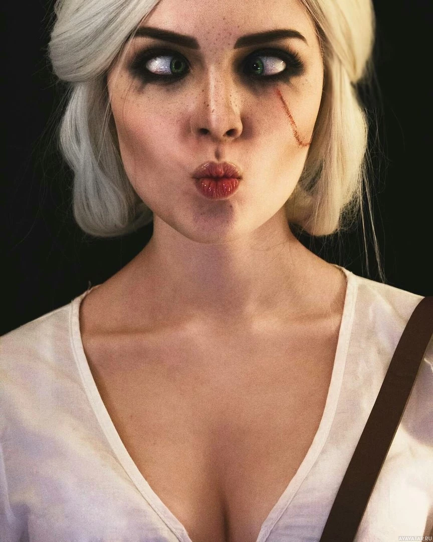 white hair and makeup, with one eye altered to include a lightning bolt-like scar mark. The outfit appears to be designed to mimic Ciri's attire from the game, including a shoulder bag that might suggest her