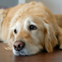 retriever dog lying on its side. The dog appears to be resting or relaxed, with one paw extended out as if it's panting after exercise or play. The setting looks like