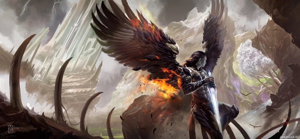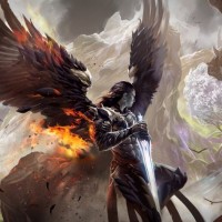 a fantasy scene with an angel-like figure at the center. The character is shown with wings and appears to be in combat, holding a sword that's glowing with some