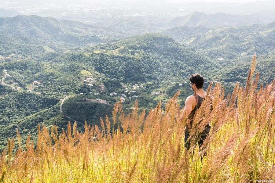 the top of a hill or mountain, overlooking a valley below. There are lush