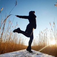 snow on the ground, indicating that it might be winter. The overall mood of the image is lively and dynamic, with the girl captured mid-motion, possibly dancing or skipping along a path.