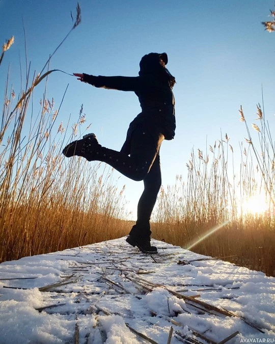 In the picture, there is a girl who appears to be enjoying herself outdoors. She is wearing black clothing and boots, suggesting she might be in colder