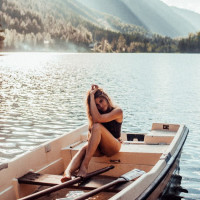 body of water within a mountainous region, possibly during the late afternoon or early evening given the warm lighting and long shadows. There are trees and a clear sky visible, indicating it's