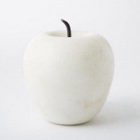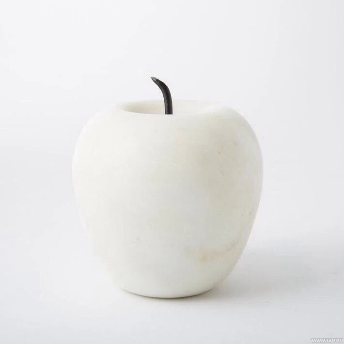 the shape of an apple with its characteristic bumpiness and stem at the top. This apple has been repurposed as a lamp or candle holder, given that it features a metal spout or candlestick protruding from its center. The object is white in color, which may suggest it is made from a material like porcelain or ceramic.