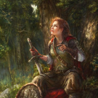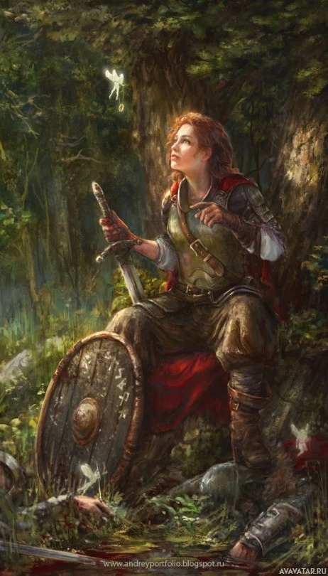 a female character dressed in what appears to be medieval armor, sitting on the ground in a forest or woodland setting. She holds a sword in one hand and