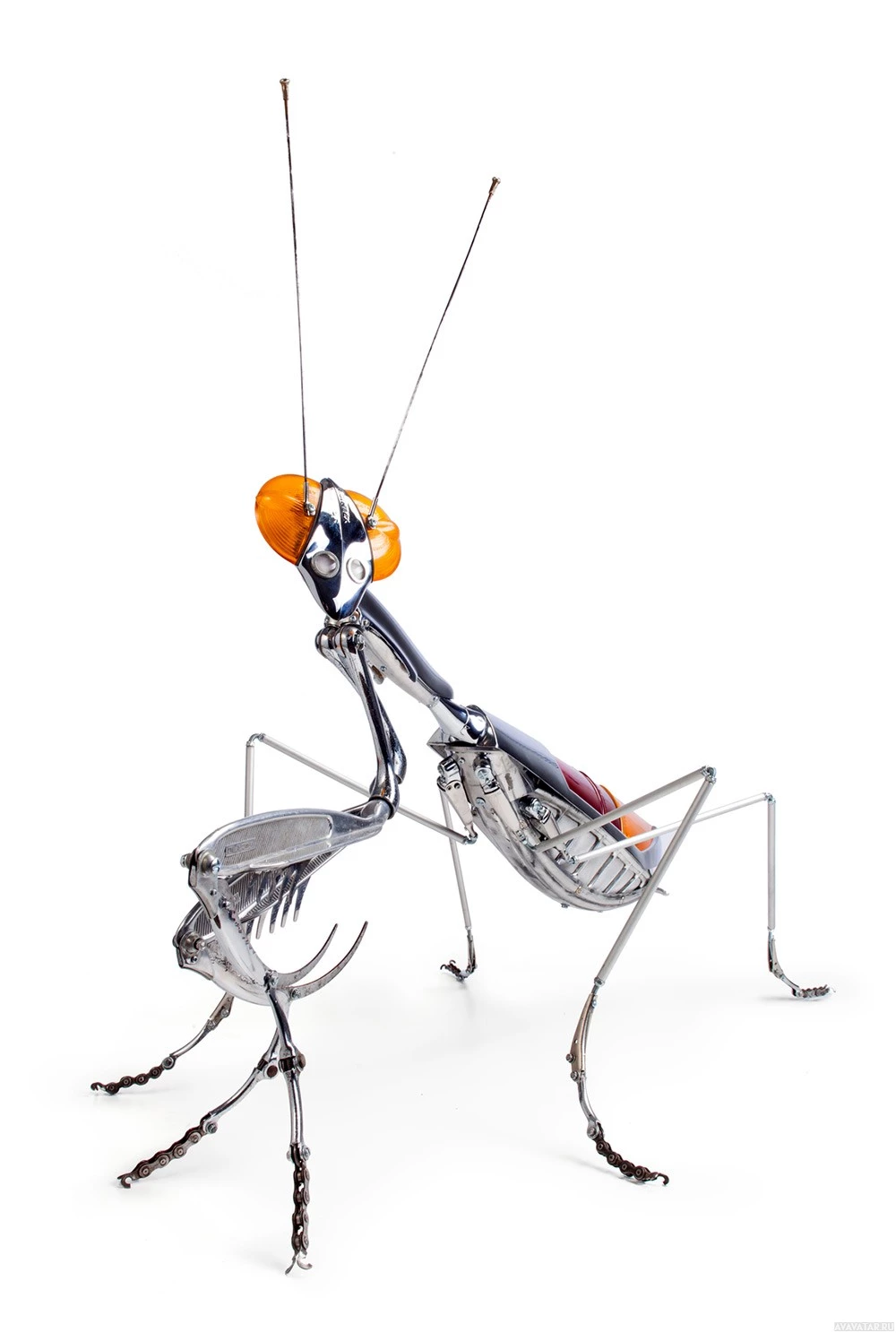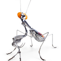 robotic creation features metallic parts and has articulated limbs that mimic the natural movement of a mantis. It's an example of