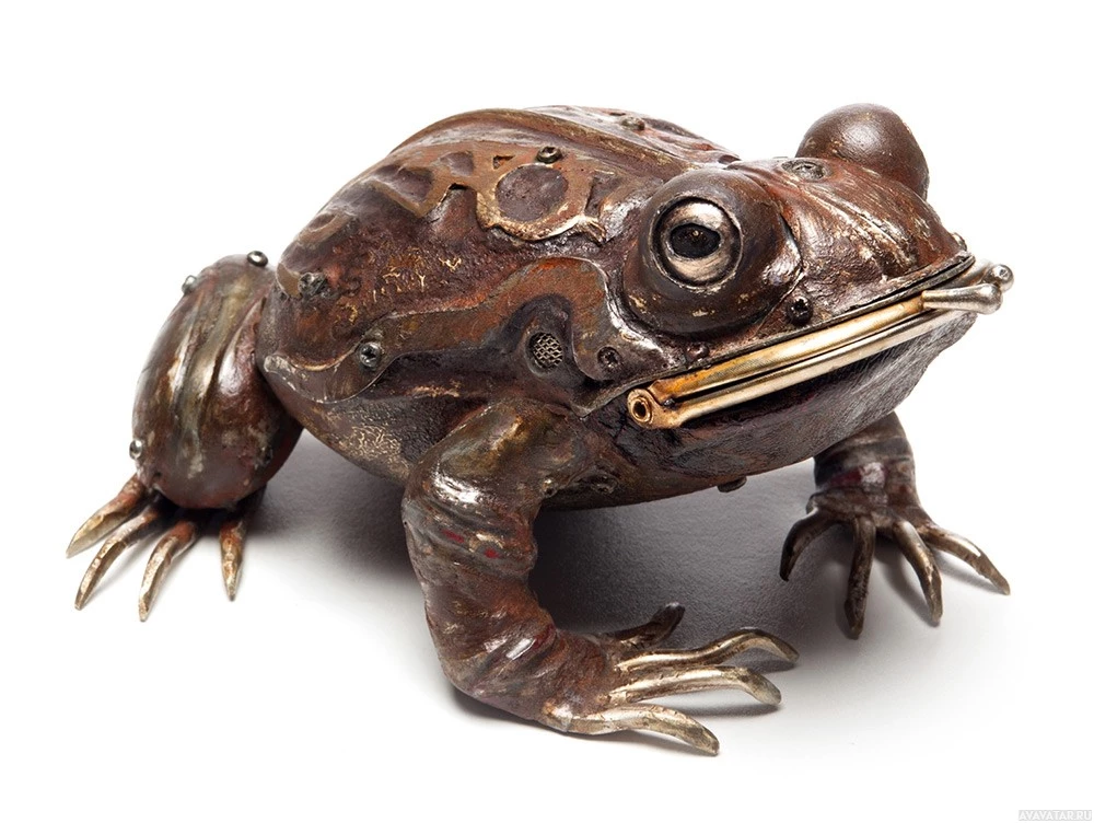 metal sculpture designed to resemble a frog. It has detailed features such as eyes, mouth, and the textured skin that mimic the appearance of