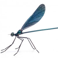 shades of blue and green on its body, which could be indicative of the species or environmental conditions where it was found. Dragonflies are often associated with aquatic environments, although