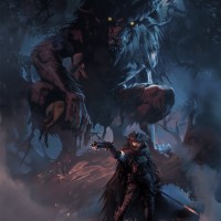 the video game "Bloodborne." The central figure appears to be a knight or warrior with armor and a weapon, standing in front of a giant wolf-like creature. The setting looks dark and ominous, fitting within the gothic horror theme of the game. This scene is likely from an encounter in the game where the player must confront this
