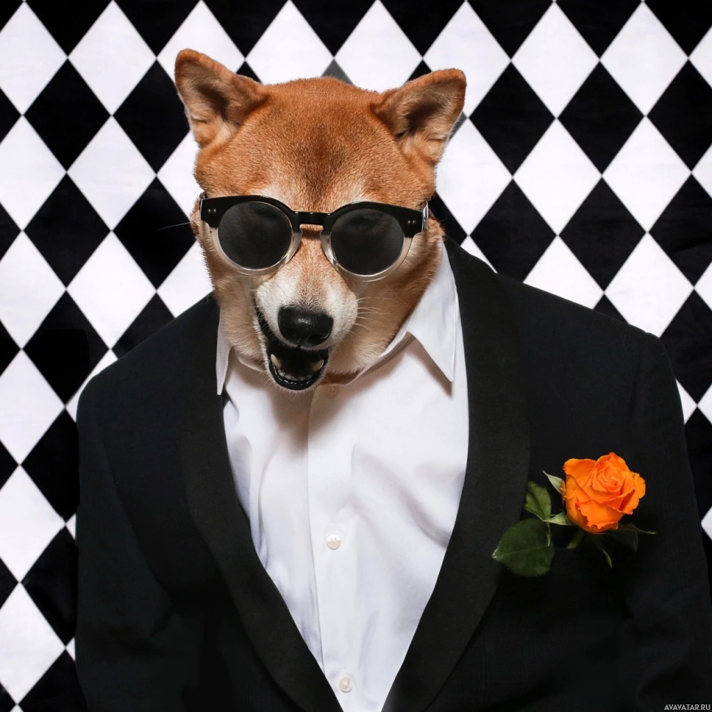human clothing, including sunglasses and a suit. The dog has a distinctive appearance with floppy ears and a wide-