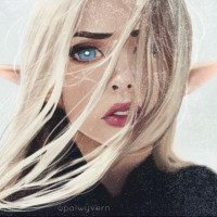 a young woman with fair skin and striking blue eyes, which are often associated with the fantasy trope of elves in mythology and popular culture. Her hair is light-colored, possibly blonde or platinum, and it appears to be styled away from her face. She has