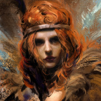 red hair. She is depicted in a stylized manner, suggesting an artistic interpretation rather than a realistic representation. The woman is adorned with feathers and what appears to be a headdress, adding an element of fantasy or