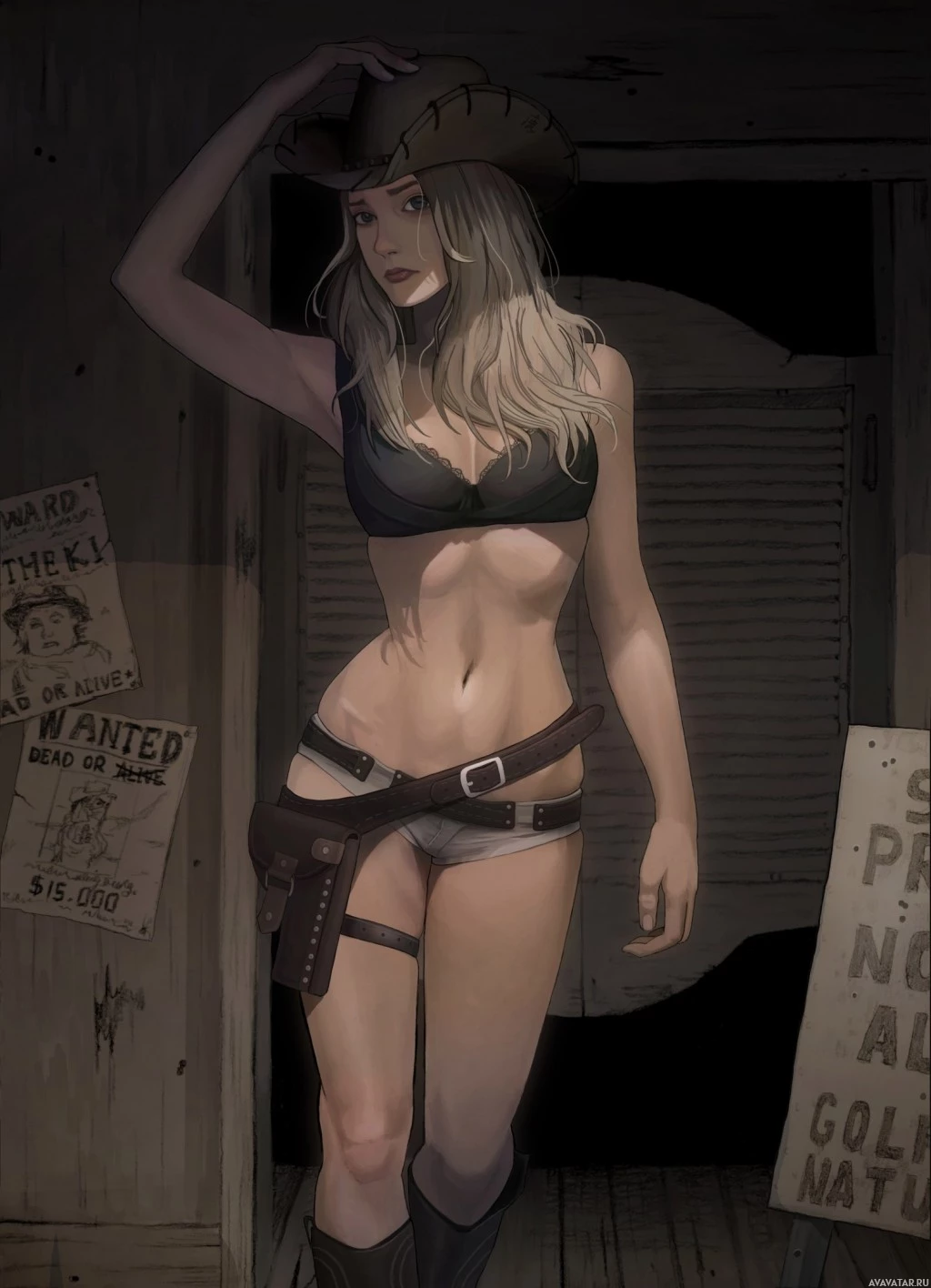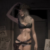 a cowboy hat, which adds to the Western theme of her attire. The background includes what looks like a weathered