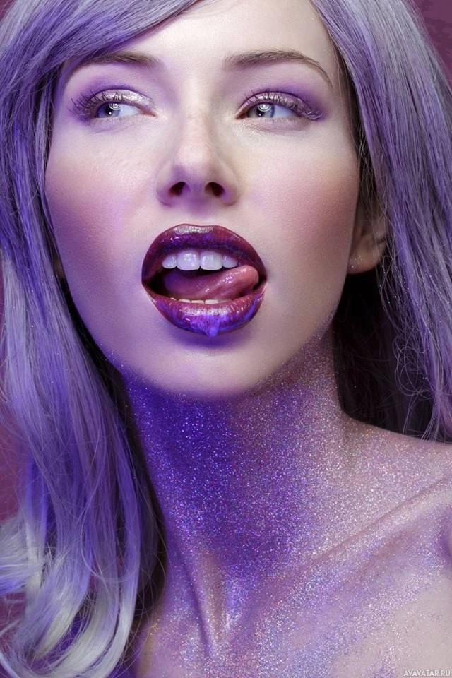 purple hair and makeup, exuding an edgy and artistic vibe. They are wearing dramatic
