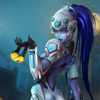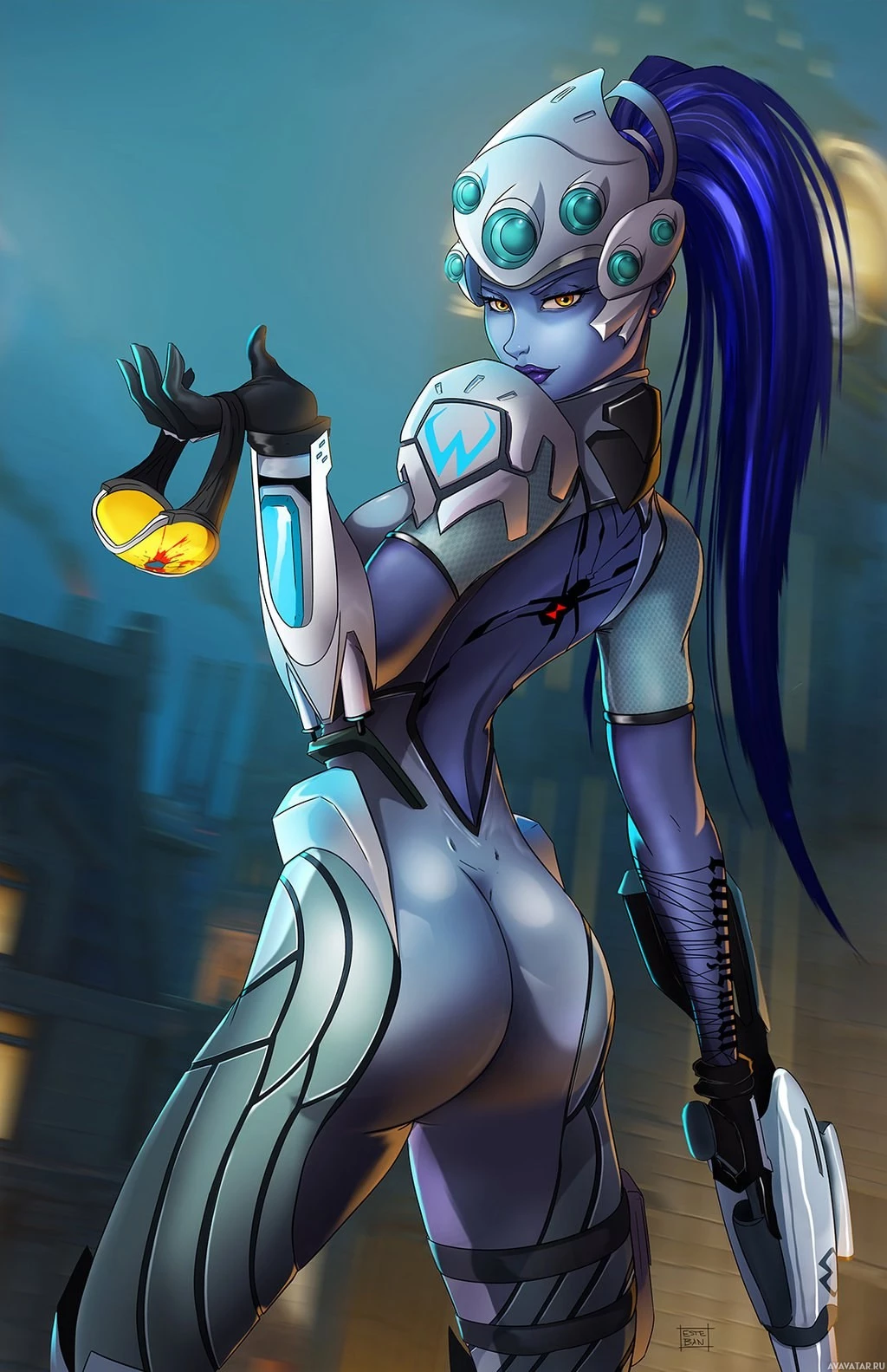 the video game "Overwatch." She is depicted in her signature pose and costume, which includes