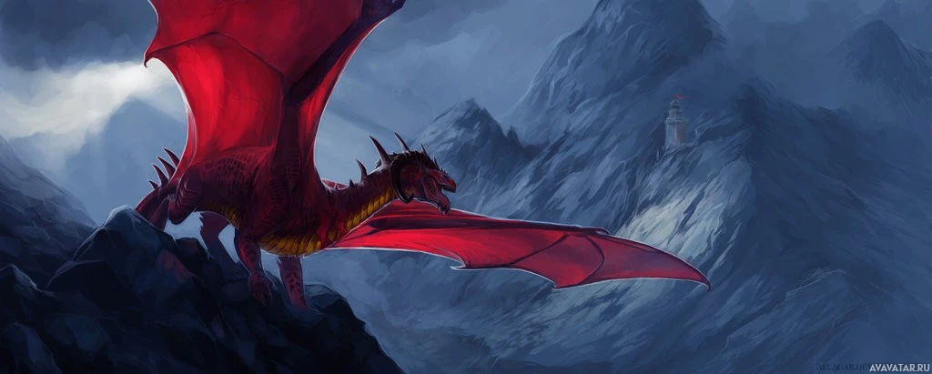 a fantasy scene featuring two dragons. One is perched on a cliff or mountain, with its wings spread wide and