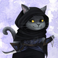 a serious expression on its face, as if it is ready for some sort of adventure or quest. It's standing upright like a human, which gives it a whimsical and anthropomorphic look. The background appears to be a subtle purple, possibly representing a mystical or otherworldly setting, which complements the character's attire and expression.