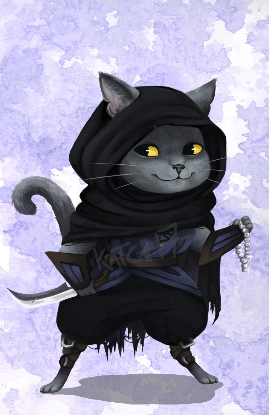 an illustrated cat with a human-like appearance. The cat is wearing a hood and has