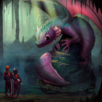 a fantastical scene with two characters, possibly humans, standing on what appears to be the bank of a river or stream. On the opposite side, there's