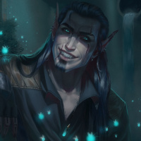 a menacing expression and is holding what looks like a magical item or artifact that is emitting light or energy, adding to the otherworldly feel of the scene. The background suggests a dark, possibly
