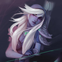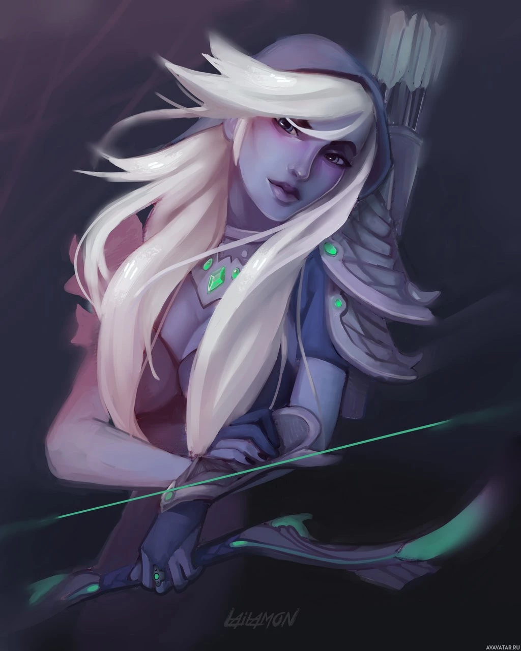 На картинке изображен анимированный персонаж, известный как Drow Ranger из игры «Dota 2». Она показана со светлыми волосами, серьезным выражением и держит лук и стрелу. Стиль произведения предполагает, что оно может быть создано художником или использовано в рекламных материалах для игры.