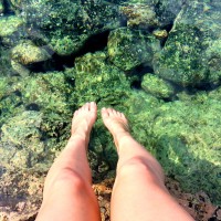 The image shows a person's feet immersed in clear, blue water with small rocks and possibly some seaweed. It appears to be a body of water such as a beach or an ocean.