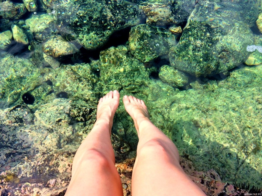 На картинке изображены ноги человека, погруженные в прозрачную голубую воду с небольшими скалами и, возможно, некоторыми водорослями. Это похоже на водоем, такой как пляж или океан.