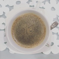 a cup of coffee with visible bubbles or foam on top, which is typical when the coffee has been poured and steamed. This indicates that the coffee might be hot. It appears to be a close-up