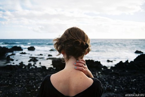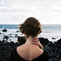 the edge of the ocean or near the shoreline, looking out towards the sea. Her hair is pulled back and she has
