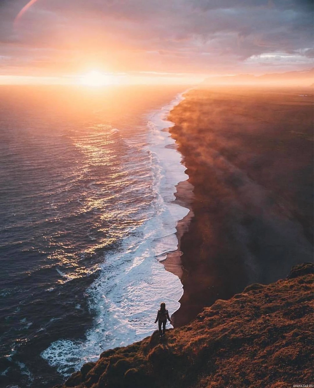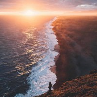the edge of a cliff overlooking the ocean. They appear to be silhouetted against