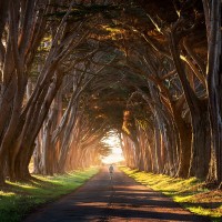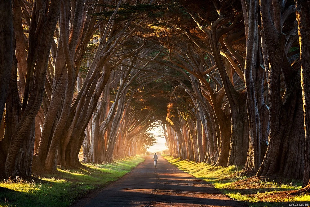 slender trees that have a distinctive appearance, resembling a tunnel of foliage. The sky is visible through the gaps in the canopy of trees above, and it appears to be sunrise or sunset based on