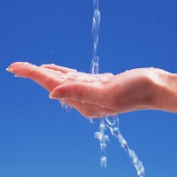 a stream of water. The hand is palm upward, and
