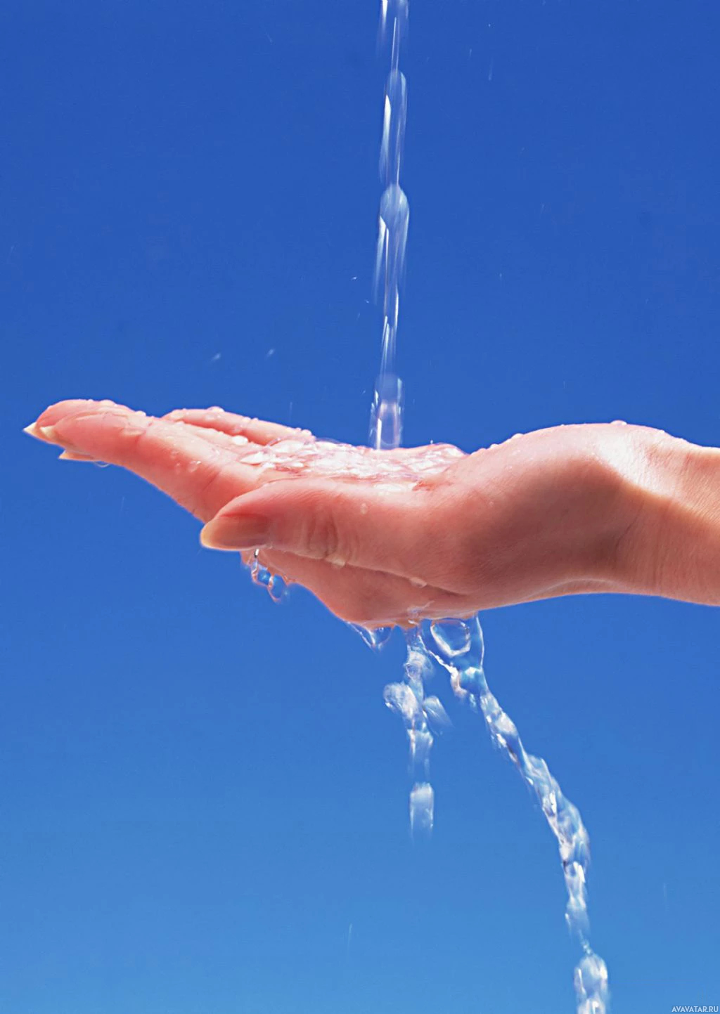 water droplets are visible as they fall from the faucet onto the palm. The background is a clear blue sky, suggesting