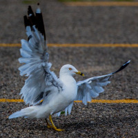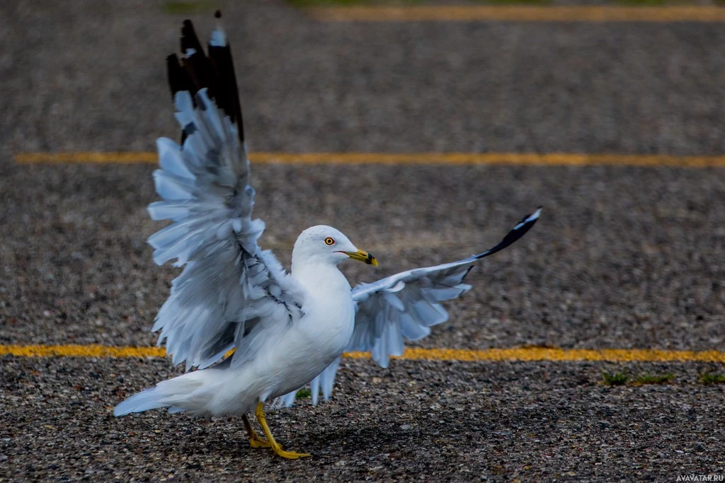 На снимке изображена чайка в полете. У птицы полностью расставлены крылья, на которых изображены белые перья с темными наконечниками, типичными для этого вида. Его клюв открыт, предполагая, что он может общаться или готовиться к посадке. Чайки известны своей адаптивностью и часто встречаются в прибрежных районах и городской среде.