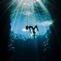 scuba diving. The individual is holding onto the edge of what appears to be an underwater cave opening, with sunlight filtering through from above, creating