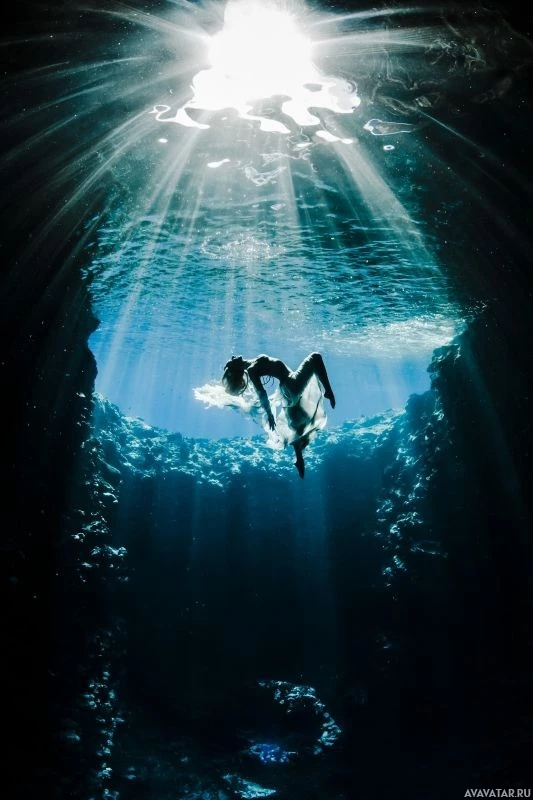 The image shows a person submerged in water, likely