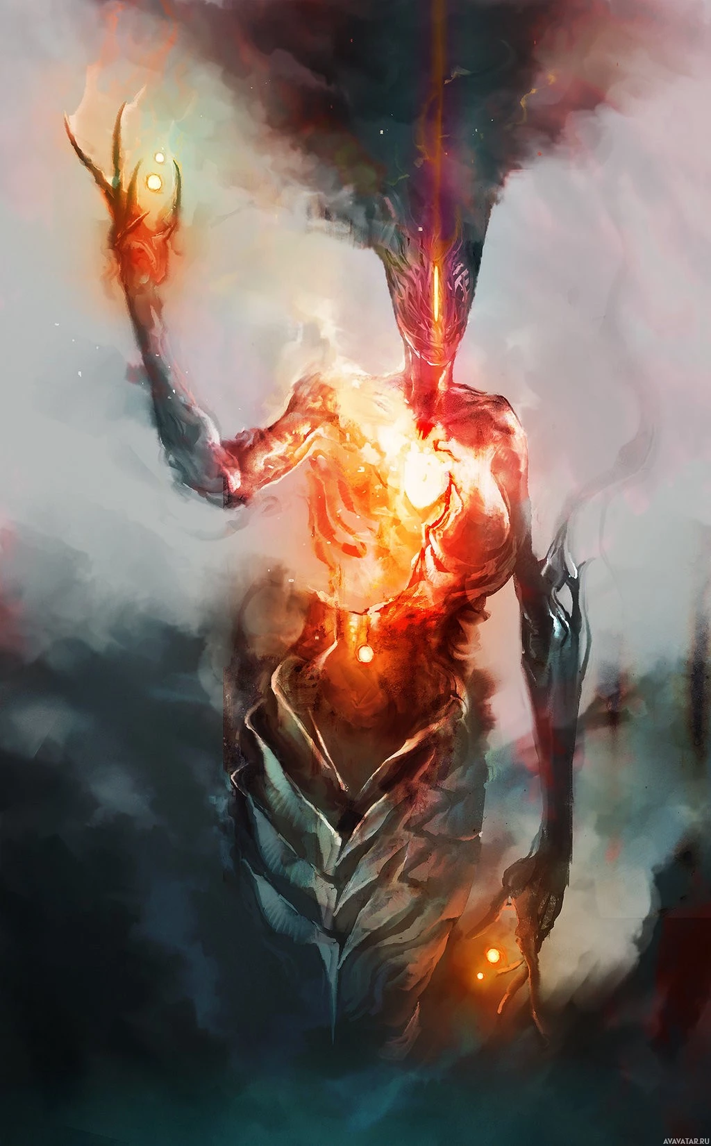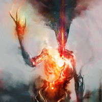 fantasy art and possibly horror elements due to the fire-like appearance of the character.