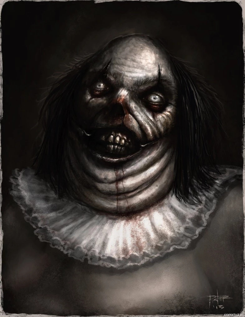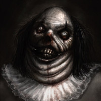 sharp teeth that are exposed in a grotesque grin. The character's hair is matted and disheveled, and there are what appears to be bloodstains on the collar of its shirt, which is torn. The style of the artwork gives it a dark,