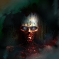 The image depicts a horror-themed scene. In the center, there is a figure that appears to be a humanoid with a pale, emaciated face and glowing