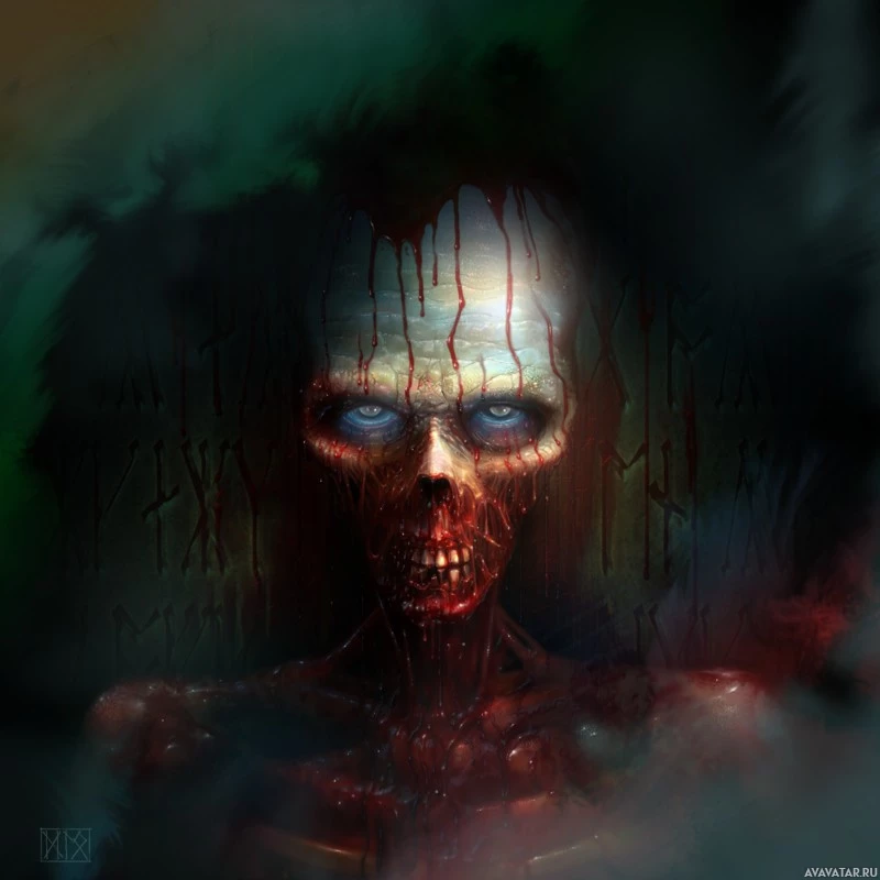 dark tendrils or roots that seem to be emerging from its skull. The background is a dark, almost ominous