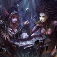 long hair and red eyes, wearing what appears to be magical armor or tattoos on their arms and legs. This character has a dark and somewhat sinister look about them. On the right, there is another character with a more