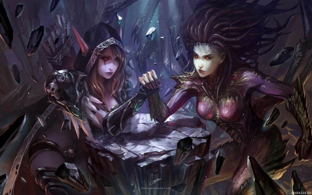 game setting, given their attire and the magical elements around them. The overall tone of the image suggests conflict and confrontation between these two figures.