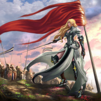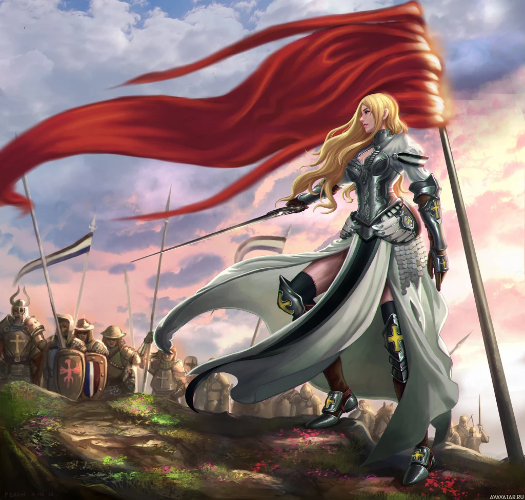 a knightly order. In her right hand, she holds a sword, indicating that she is prepared for combat. Behind her, there are flags fluttering in the wind, suggesting
