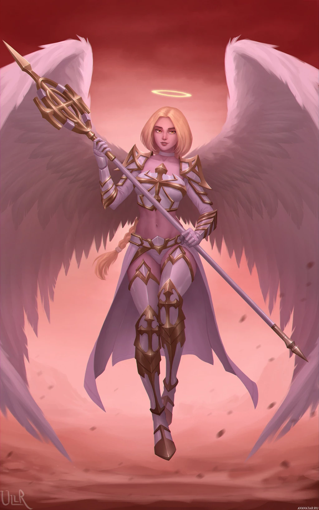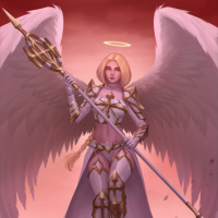 The image depicts a fantasy-themed character, likely an angel given the context provided. The character is portrayed with wings and is holding a sword. They are wearing armor that suggests a blend of classic