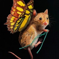 vibrant wings attached to its back. These wings are patterned in colors resembling those of a butterfly, and the mouse is depicted with human-like arms that appear to be holding on to something. The style of the picture suggests it might be an artistic representation rather than a photograph of