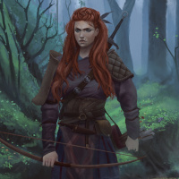 a quiver of arrows on her back and is holding a bow in one hand. Her gaze is directed off to the side, giving her a stern or focused expression. The setting is