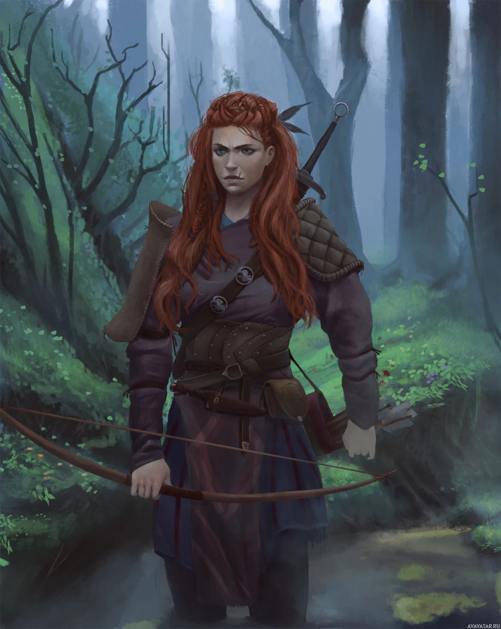 red hair, dressed in what appears to be historical or fantasy-themed attire. She has
