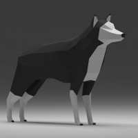 The image shows a 3D rendering of a wolf, which is an animal and commonly referred to as a dog. The wolf appears in profile view against a gray background, with its body facing the viewer while its head turned towards one side.