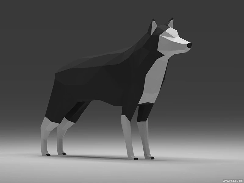 Картинка показывает 3D-рендеринг волка, который является животным и обычно упоминается как собака. Волк появляется в профильном виде на сером фоне, тело которого обращено к зрителю, а голова обращена в одну сторону.