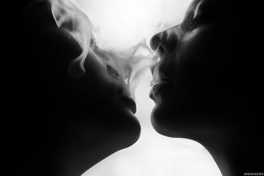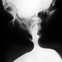 intimate pose where they appear to be kissing or about to kiss. Smoke is visible between their mouths, suggesting that one or both of them are smoking a cigarette or similar smoke-emitting object. The background is dark and indistinct, providing